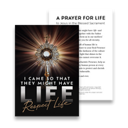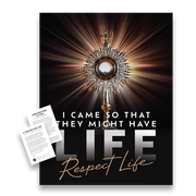 A poster (bilingual) and prayer card (one each in English and Spanish) feature the Eucharist and Jesus’ message in John 10:10, “I came so that they might have life.”