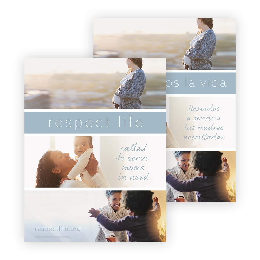 Poster features imagery illustrating the beauty and joy of motherhood. The tagline highlights the call to serve moms in need as part of the call to Respect Life.